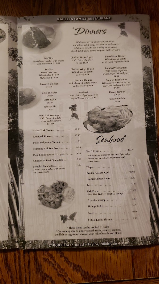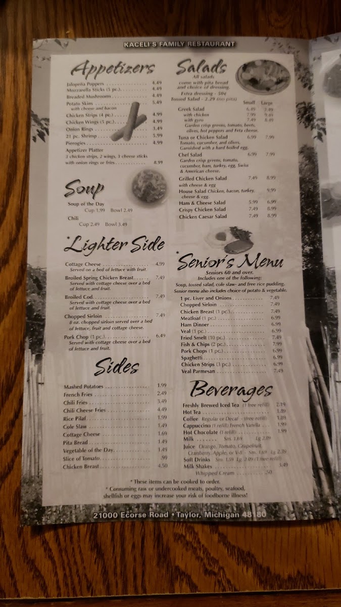 Welcome to Kaceli’s Family Restaurant, a delightful culinary gem located in Taylor, Michigan, offering a comforting and diverse menu perfect for families and food lovers alike. As you explore the offerings, you’ll be treated to a variety of new pita sandwiches, including savory options like the Tuna Wrap and the indulgent Reuben Wrap, all priced affordably. Sides like Chili Fries and Mashed Potatoes complement any meal beautifully.
